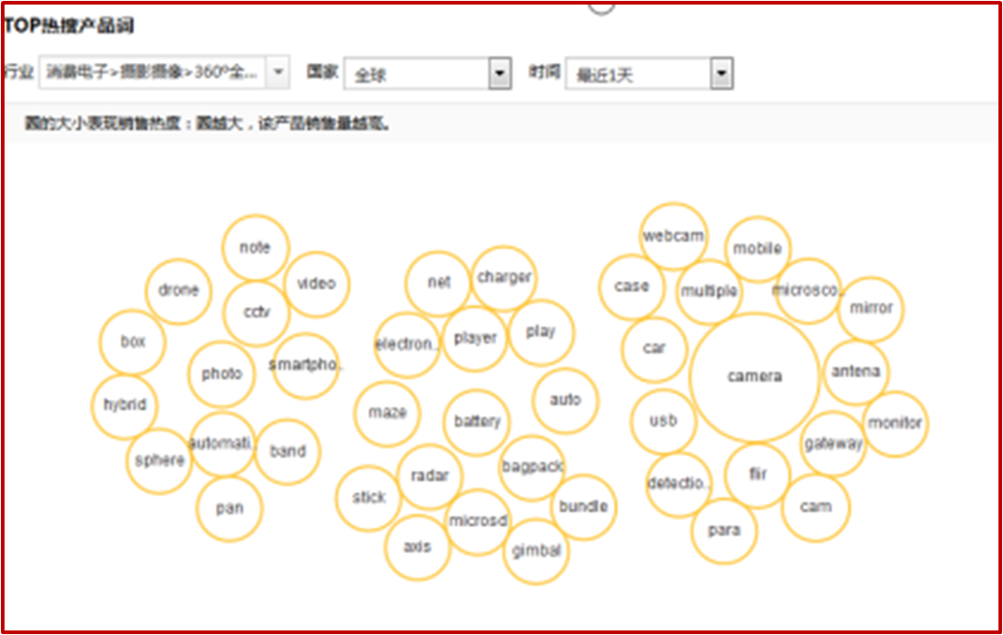 热搜的品类,圆圈越大,热