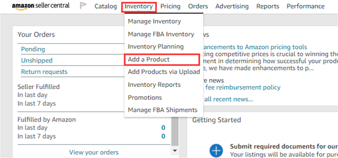 登入卖家后台后,鼠标移至库存“inventory”,点击添加新商品“add a product”。