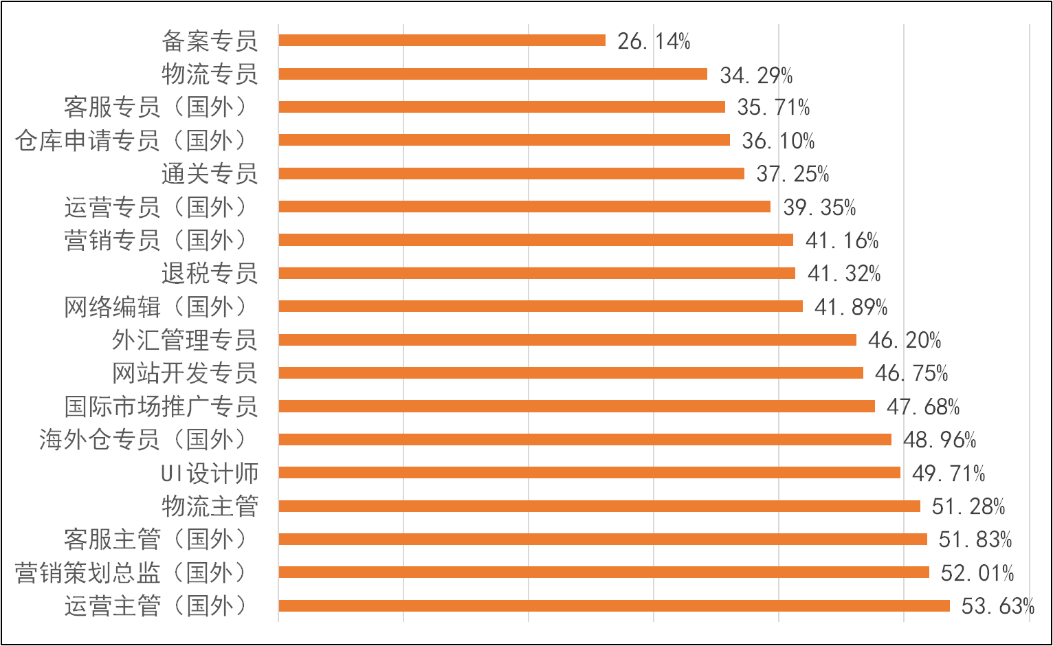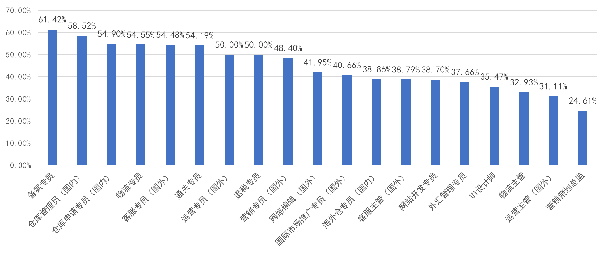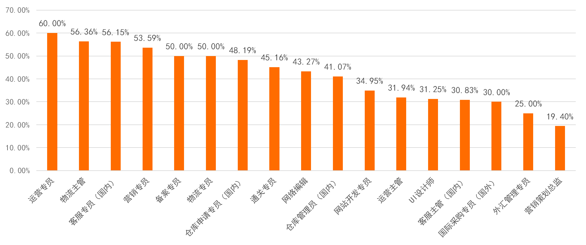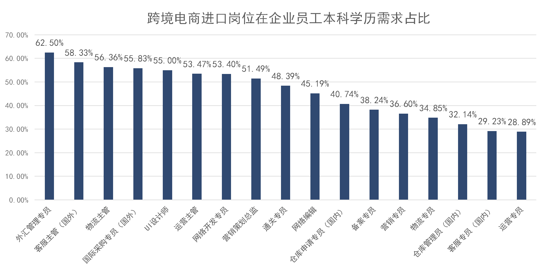 下图就是所调查跨境电商出口岗位在企业中的高职高专学历需求占比。各种专员岗
