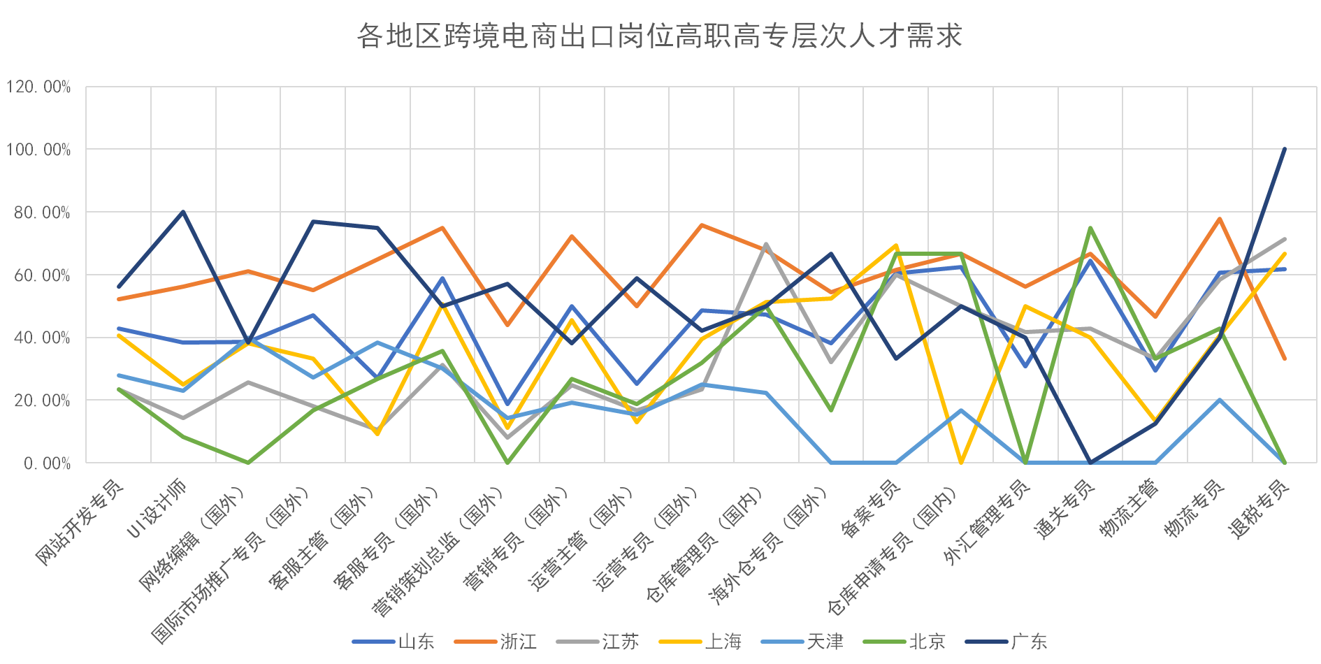 具体各地区跨境电子商务出口岗位高职高专学历人才需求情况如折线图所示。