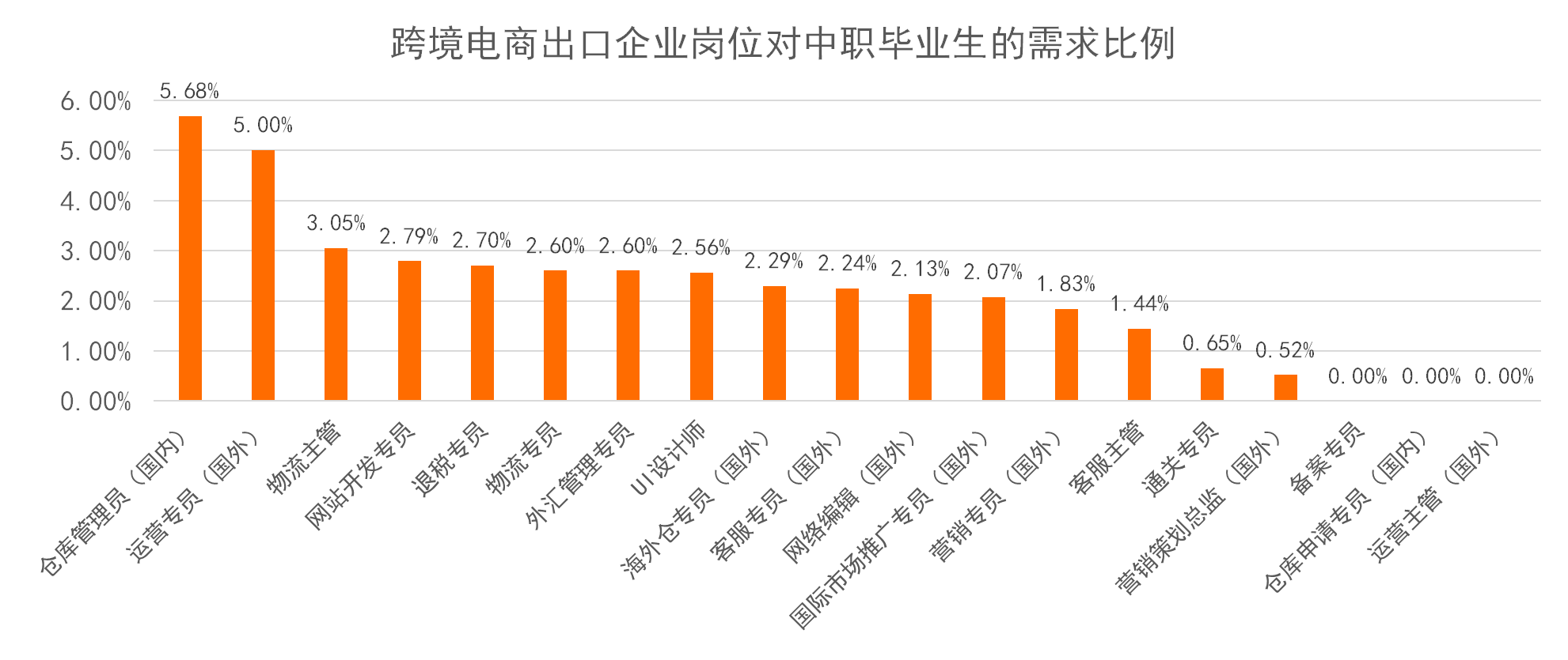在跨境电子商务出口人才需求方面,对高职高专人才需求比例较高的岗位有备案专