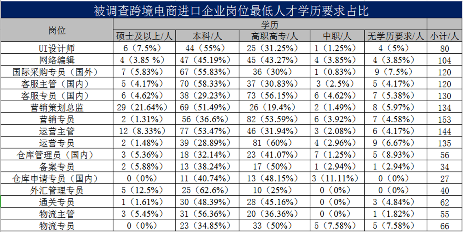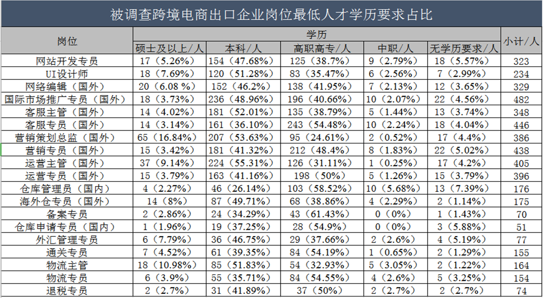 与跨境电子商务出口人才需求类似,不同地区对同一岗位的学历要求