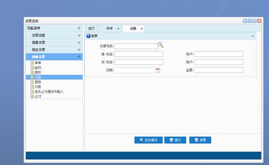 支票号码处加入校验,要求付款支票号码需经过复核阶段方可付款提交,复核未通过的在付款提交时提示“该笔业务尚未复核”