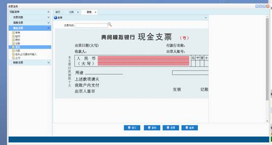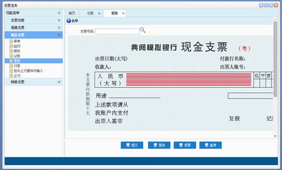 目前盖章流程在复核菜单中,见上图,点击盖章会出现公司财务章,此处错误,需改正。盖章流程改正如下:1.在题目中给出的支票图片中单位财务章已经盖好,2.记账业务时加入盖章按钮,加入上图图表(财务章已盖好),点击盖章后在图表中记账后红框处出现已记账”(红色)字样,3.复核业务时查找支票号码反显出“记账盖章结果(显示已记账(红色)或空值),做复核业务时点击盖章后在图表中复核后红框处出现已复核”(红色)字样;